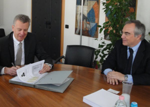 (LPA) In der Bozner Siemens-Straße entsteht das neue Data-Center, in dem die enorme, von der Landesverwaltung zu bearbeitende Datenmenge zusammenfließen wird. Den Aufbau des dafür nötigen Netzes übernimmt "Telecom Italia", den entsprechenden Vertrag hat Informatik-Landesrat Roberto Bizzo heute (23. April) unterzeichnet.