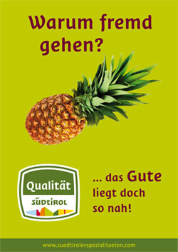 Das Ziel der Kampagne ist ein einfaches: "Wir wollen unsere Konsumenten dazu anregen, Produkte mit dem Qualitätszeichen jenen aus fernen Ländern vorzuziehen", so Widmann. Dabei setzt man auf den provokativ-witzigen Slogan "Warum fremd gehen?… das Gute liegt doch so nah!" und kombiniert diesen mit einer Ananas oder Kokosnuss und dem Qualitätszeichen. Die Kampagne wird in Printmedien, im Internet, an Bushaltestellen und auf den Erdgasbussen in Bozen und Meran zu sehen sein.
