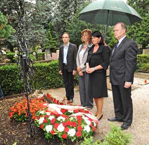 LPA - Als Zeichen der Wertschätzung hat die Salzburger Landeshauptfrau Gabi Burstaller heute, 17. Juni, in Bozen im Beisein von Landesrätin Sabina Kasslatter Mur einen Kranz am Grab des ehemaligen Südtiroler Landeshauptmann Silvius Magnago niedergelegt.