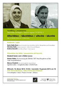 Der Band "Alteritäten - Identitäten / alterità - identità" wird am Mittwoch, dem 18. Jänner, um 18.00 Uhr an der Freien Universität Bozen am Universitätsplatz 1 in Bozen vorgestellt; Details im Anhang.
