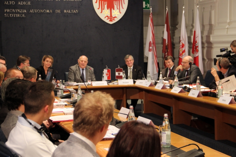 Als Präsident des Europäischen Verbunds territorialer Zusammenarbeit hat Landeshauptmann Luis Durnwalder zum zweiten Mal nach der Gründung im vorigen Jahr die EVTZ-Vollversammlung einberufen. Diese setzt sich aus zwölf Mitgliedern aus den drei Mitgliedsländern Tirol, Südtirol und Trentino zusammen, und zwar aus dem jeweiligen Landeshauptmann, einem weiteren Mitglied der Landesregierung, dem Landtagspräsidenten und einem Abgeordneten. Auf der Tagesordnung der heutigen Versammlung standen ein Überblick über die Tätigkeiten des vergangenen Jahres, der Haushaltsvoranschlag 2013 und die Tätigkeitsschwerpunkte für das kommende Jahr.
