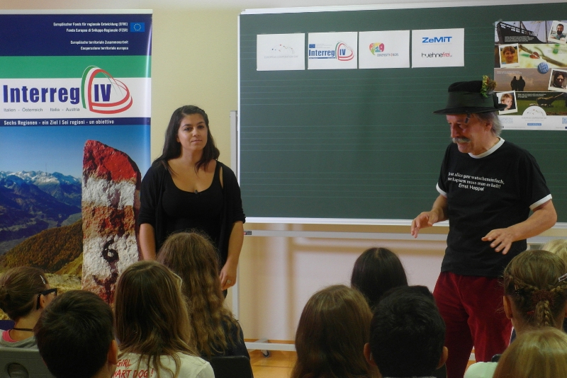 Die Sterzingerin Evelyn Mair und der Oberösterreicher Helmut Wittmann schafften es, unter dem Motto „gemeinsam Grenzen überwinden" die 12-jährigen Schülerinnen und Schüler der beiden Klassen mit ihren Erzählungen im munteren italienisch-österreichischen Wechselspiel zu fesseln und aktiv in das fiktive Geschehen einzubauen. Großes Interesse fand auch der anschließende Erzählworkshop.