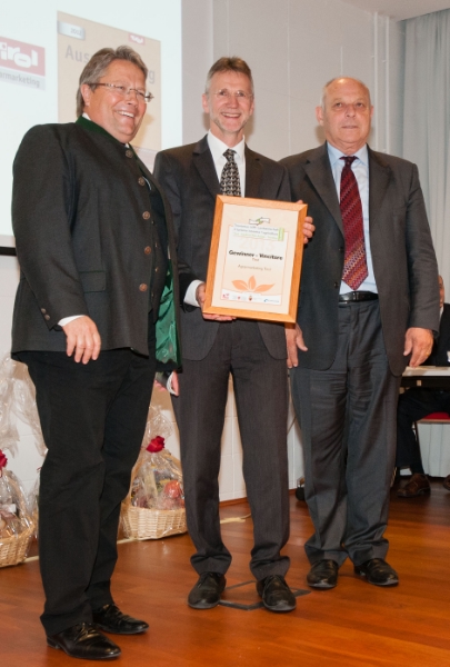 Der Landeshauptmann war es dann auch, der die vier Siegerprojekte heute in der Messe Bozen mit Nationalrat Franz Hörl als Vertreter des Bundeslands Tirol und Paolo Nicoletti, Leiter der Trentiner Landesabteilung für Landwirtschaft und Tourismus, prämiert hat. Gekürt worden waren sie von einer Fachjury, und zwar für alle drei Euregio-Länder. In Südtirol gibt's dabei zwei ex-aequo-Sieger. Das eine ist das Projekt "Pur Südtirol - die Genussmärkte -So schmeckt unser Land" der Meraner Weinhaus GmbH, die zwei Genussmärkte in Meran und Bruneck sowie zehn weitere Verkaufspunkte in Geschäften im ganzen Land betreibt. Dort werden 1600 Produkte von 137 Bauern und 28 bäuerlichen Genossenschaften verkauft, wobei die Kunden je zur Hälfte Südtiroler bzw. Touristen sind. Zudem werden die bäuerlichen Produkte auch online vertrieben, der Online-Shop verzeichnet rund 2000 Besucher in der Woche.