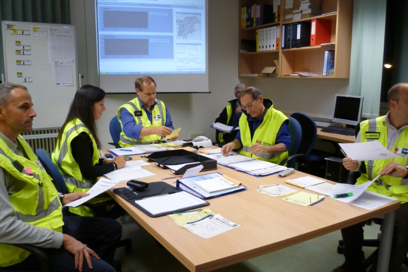 Im Rahmen einer Videokonferenz verschafften sich die Verantwortlichen um 18.00 Uhr einen ersten Überblick über die Lage; zugeschaltet waren die Hochwasserzentrale, das Lagezentrum, das Hydrografische Amt und in einem zweiten Moment auch die Verkehrsmeldezentrale. Die Lage spitzte sich fiktiv zu: Wenn es so weiter regnete, würde die Warnstufe bald erreicht und eine Hochwasserwelle im Anmarsch sein. Um etwa 18.30 Uhr war an allen Pegelmessstellen die Warnstufe erreicht. Mit Hilfe einer zweiten Videokonferenz wurde ein Situationsvergleich gezogen. Vorsichtshalber wollte Hanspeter Staffler, Direktor der Landesabteilung Brand- und Zivilschutz, schon wissen, wie viele Sandsäcke für den Ernstfall zur Verfügung stehen würden. In elfeinhalb Minuten lieferte die Landesabteilung Wasserschutzbauten die Anwort: rund 260.000, aufgeteilt auf Lager zwischen Meran und Salurn.