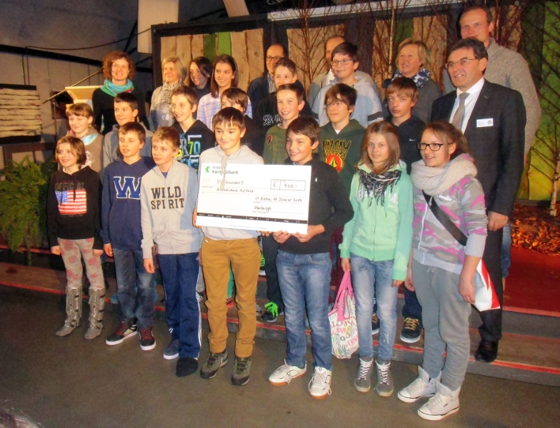 Die Sarntaler Schüler freuten sich gemeinsam mit ihren Betreuern der Landesabteilungen Wasserschutzbauten und Forstwirtschaft und dem Südtiroler Landesforstdirektor Paul Profanter über einen Scheck in der Höhe von 400 Euro für die Klassenkasse.