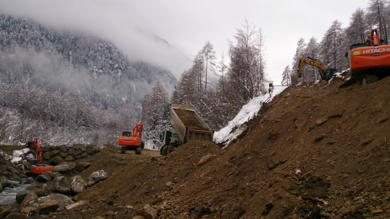 Nach dem Steinschlag vergangene Woche waren die Arbeiter in Schichtbetrieb durchgehend im Einsatz, um die 1,1 Kilometer lange Umfahrungsstraße zu bauen, die künftig auch die definitive Trasse der Staatsstraße nach Taufers sein soll. In bis zu drei Schichten waren beim Bau 14 Bagger, Radlader und Schubraupen und 16 Lastkraftwagen sowie 19 Arbeiter im Einsatz.