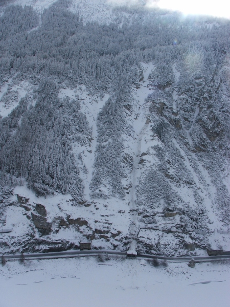 "Der größte Teil des Steinschlags", berichtet der Direktor des Landesamtes für Geologie und Baustoffprüfung Volkmar Mair, "ist über der Steinschlaggalerie abgegangen und hat teilweise den See erreicht; lediglich kleinere Blöcke mit bis zu 50 Zentimeter Durchmesser sind auf die Straße gefallen. Die Abbruchstelle befindet sich ziemlich weit oben, am Fuße der Felswand im Gipfelbereich".