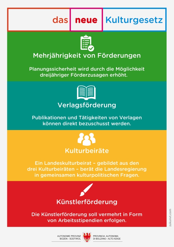 Weitere wichtige Neuerungen betreffen beispielsweise die Möglichkeit der direkten Verlagsförderung für Publikationen und Übersetzungen mit besonderem Südtirolbezug sowie die Film- und Medienförderung für Produktionen mit einem kulturellen und dokumentarischen Wert. Der Kreis der Anspruchsberechtigten wird dabei auf Produktionsgesellschaften und junge Filmschaffende ausgeweitet.