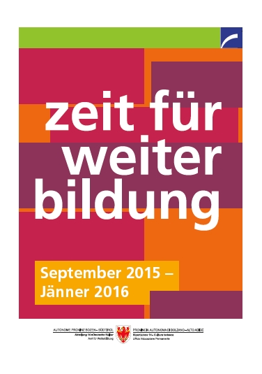 Die vom Amt für Weiterbildung des Landes herausgegebene Broschüre „Zeit für Weiterbildung“ erscheint zweimal Jährlich und enthält umfassende Informationen über das Kursangebot in Südtirol: Sprachen, Gesundheit, Kreativität, berufliche Qualifikation, Persönlichkeitsentfaltung, kulturelle sowie soziale Bildung und vieles mehr. Die Ausgabe September 2015 – Jänner 2016 ist jetzt kostenlos erhältlich.
