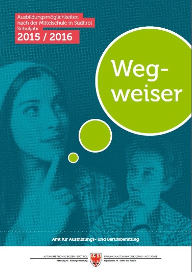 Die Broschüre "Wegweiser" ist eine wertvolle Entscheidungshilfe für Mittelschulabgänger, Eltern und Lehrpersonen. Sie bietet kurz gefasst und überschaubar alle Informationen zu Lehre und Schule, listet alle Bildungsangebote auf, versorgt die Interessierten mit den nötigen Kontaktadressen und stellt auch die Stundentafeln der verschiedenen Schulen dar.