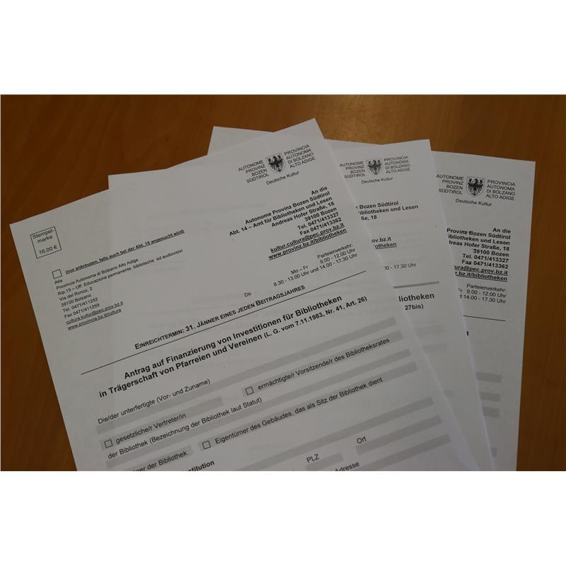Die Beitragsansuchen sind mit einer Stempelmarke zu 16,00 Euro zu versehen und mit den vorgeschriebenen Unterlagen bis spätestens Montag, 1. Februar 2016, beim Amt für Bibliotheken und Lesen in der Andreas-Hofer-Straße 18 in Bozen einzureichen. Wird das Ansuchen mit eingeschriebenem Brief gesandt, gilt das Datum des Stempels des Annahmepostamtes.