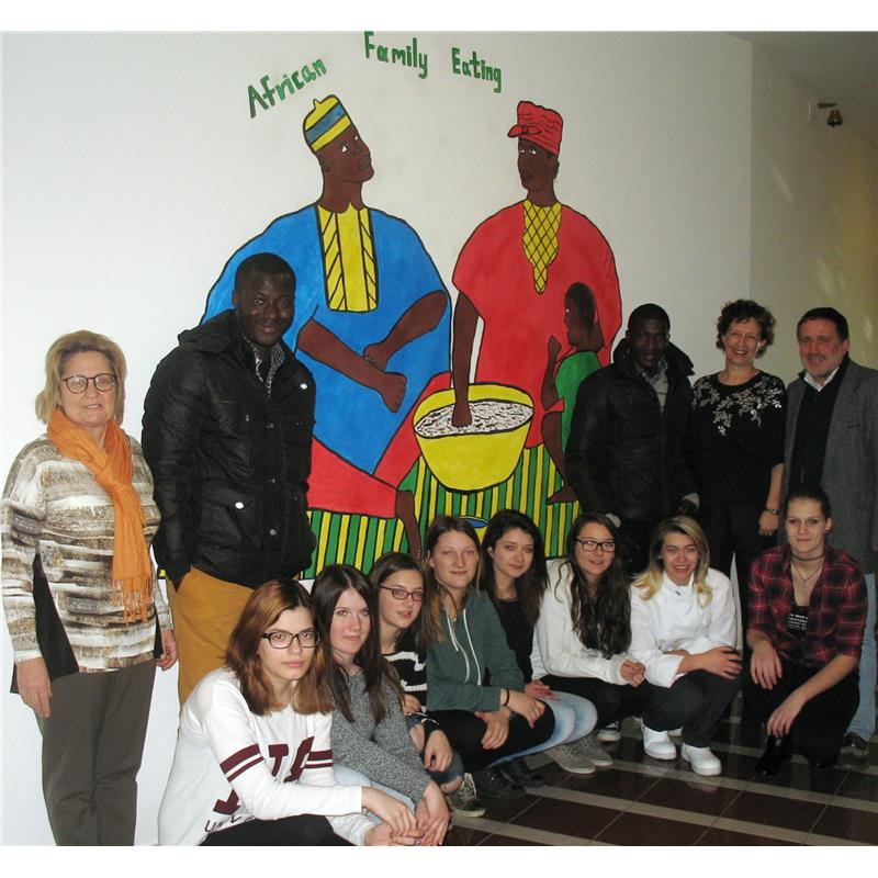 Die "Malergruppe" traf sich mehrmals in der Freizeit am Nachmittag, prüfte Skizzen, zeichnete und bepinselte mit kräftigen Acrylfarben die weiße schmucklose Korridorwand. Die zwei jungen Burschen Ibrahim und Lamin aus Gambia erwiesen sich als nette Lehrmeister der Mädchen und sie freuten sich, etwas Kreatives tun zu dürfen. Die sprachlichen Hürden konnten mit etwas Geduld und Gestik auch gemeistert werden.