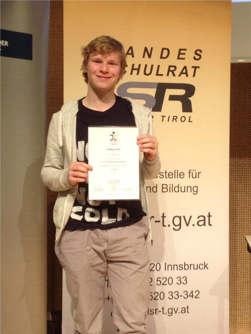 Beim Gesamttiroler Fremdsprachenwettbewerb für die berufsbildenden Schulen in Innsbruck setzte er sich gegen seine Konkurrenten durch und konnte den sensationellen zweiten Platz erringen. Sensationell deshalb, weil die 25 Teilnehmenden, die zum Teil mehrmonatige Auslandsaufenthalte und mehr Englischstunden in der Schule aufweisen konnten, in einem Wettkampf auf höchstem Niveau gegeneinander antraten. Es galt, eine vierköpfige Jury mit Argumenten und sprachlicher Kompetenz zu überzeugen. Thomas Ninz schaffte alle Bewerbe mit Bravour, stellte sein hervorragendes Englisch, seine soziale Kompetenz sowie Teamfähigkeit unter Beweis und konnte sich über einen schönen Geldpreis freuen.