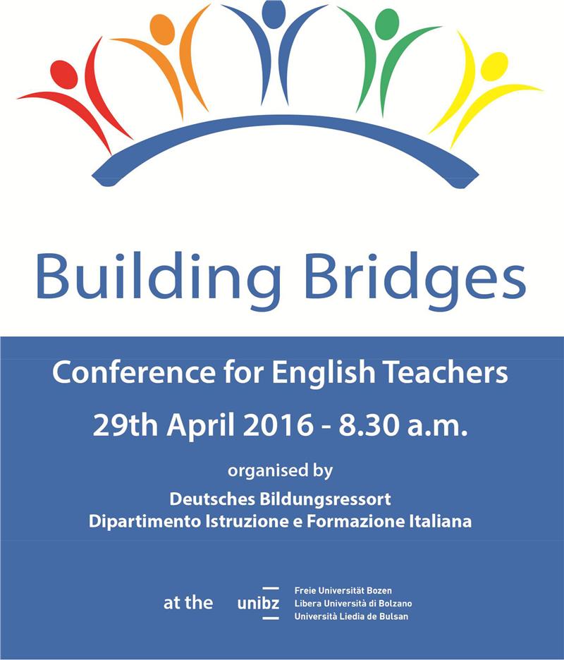 Zum fünften Mal organisiert der Bereich Innovation und Beratung des Deutsche Bildungsressorts in Zusammenarbeit mit der Area Pedagogica des italienischen Bildungsressorts und der Freien Universität Bozen im Zweijahresrhythmus eine Konferenz für Lehrpersonen des Faches Englisch. Vor zwei Jahren hatten über 400 Lehrpersonen an der Konferenz aktiv teilgenommen. Die heurige Tagung findet unter dem Motto "Building Bridges" (Brücken bauen) statt. Schwerpunkt ist in diesem Jahr die Beziehungsebene im Englischunterricht, jene zwischen den Lernenden, zwischen Lehrpersonen und Lernenden und natürlich auch zwischen den Lehrpersonen.