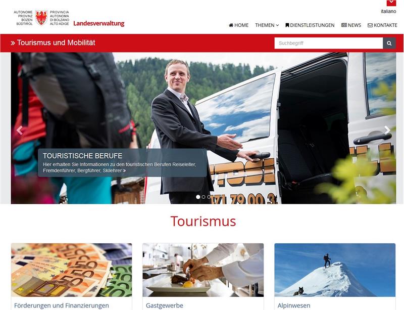 Eine einfache Nutzung, eine klare und ansprechende Gestaltung sowie eine übersichtliche Themenauswahl sind die wichtigsten Vorzüge des neuen Themenportals „Tourismus“ der Südtiroler Landesverwaltung. Die neue Internetseite unter provinz.bz.it/tourismus wurde vom Funktionsbereich Tourismus in Zusammenarbeit mit der Südtiroler Informatik AG (SIAG) erstellt. Sie ist eine wichtige Informationsquelle für alle Tourismustreibenden in Südtirol. Nicht nur das Layout wurde neu konzipiert, sondern auch die bestehenden Inhalte sind klar in Themenblöcke aufgeteilt worden, damit die Bürger alle Infos und Kontakte leichter finden können und die Navigation durch das Themenportal angenehmer wird.