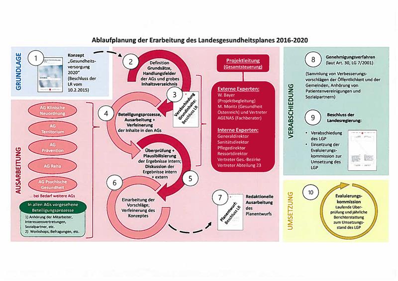 Der Landesgesundheitsplan ist ein strategischer Leitfaden, mit dem die verschiedenen Dienste und Leistungen zum Schutz, zur Förderung und zur Wiederherstellung der Gesundheit der Menschen in Südtirol dargelegt, koordiniert und organisiert werden. Der aktuelle Rahmenplan stammt aus dem Jahr 1999 und galt ursprünglich für die Jahre 2000 bis 2002. Es ist in den vergangenen Monaten von einer Arbeitsgruppe um die Experten Wolfgang Bayer, Michaela Moritz und Francesco Longo unter Einbezug von mehr als 300 Rückmeldungen von den Führungskräften und Mitarbeitern des Sanitätsbetriebes in den Gesundheitsbezirken, den Interessensvertretungen und den Sozialpartnern überarbeitet worden (siehe Vorstellung der Experten im Oktober 2015: http://www.provinz.bz.it/news/de/news.asp?news_action=4&news_article_id=517534). Nun hat die Südtiroler Landesregierung den vorgelegten Expertenentwurf für die nächsten Schritte in der Genehmigung des Landesgesundheitsplanes 2016-2020 freigegeben.