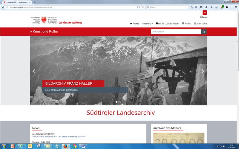 http://www.provinz.bz.it/landesarchiv ist die Adresse der neuen Internetseite des Landesarchives, die kürzlich online geschalten wurde. Dank einer völlig neuen grafischen Gestaltung, einem übersichtlichen Seitenaufbau und einer starken GSA-Suchmaschine im Hintergrund sind alle Inhalte des Landesarchives nun leicht zugänglich und schnell abrufbar. Außerdem ist die Seite als responsive Webseite programmiert, das heißt sie wird auf allen Endgeräten (Laptops, Desktop-Computern, Tablets, Smartphones, E-Book-Readern und Fernsehgeräten) korrekt angezeigt.