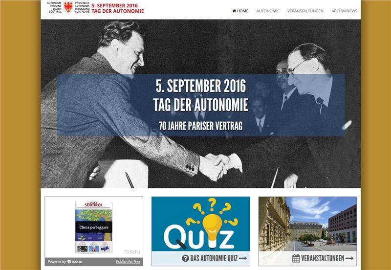 Von besonderem Interesse der Bürger, jung wie alt, dürfte folgendes multimediale Angebot sein: Gleich auf der Titelseite (s. Screenshot im Anhang) werden Besucher eingeladen, an einem täglich neuen Autonomie-Quiz teilzunehmen. Damit kann jeder Einzelne prüfen, wie viel er oder sie über die Autonomie und ihren Werdegang weiß. Dazu werden die Leser auf die Facebook-Seite des Landes Südtirol gelinkt. Die Ergebnisse werden aber nicht veröffentlicht sondern bleiben für jeden einzelnen Account vertraulich. Da die Fragen täglich erneuert werden, gelangen Interessierte am Ende auf spielerische Weise zu einem beachtlichen Wissen über die Autonomie.