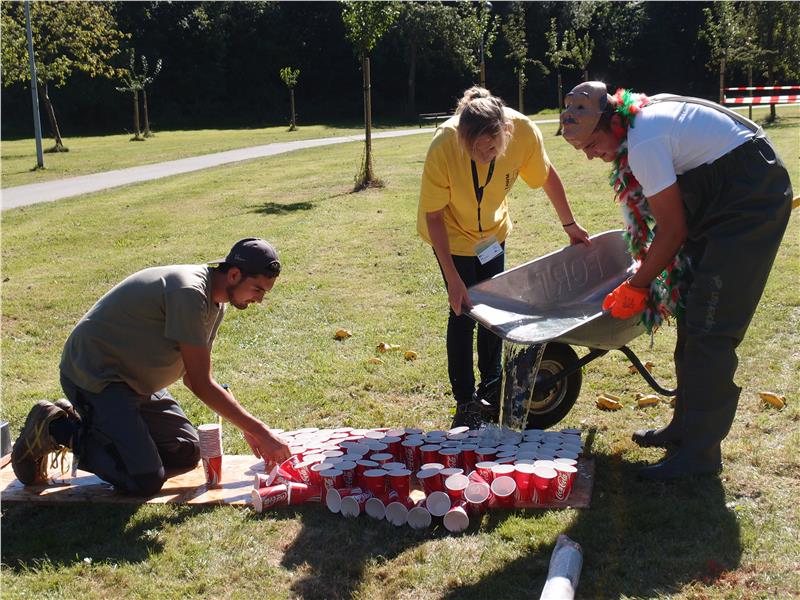 Spaß stand bei der Schubkarrenrallye im Vordergrund, bei welcher die Teams in „Sicherheits-Kleidung“ Wasser in einer Schubkarre über Hindernisse transportieren mussten und schließlich in Becher abfüllten. Auch hier erhielt ein Südtiroler, Dominik Gaiser, einen Sonderpreis, da er diese Aufgabe im internationalen Team am besten löste.
