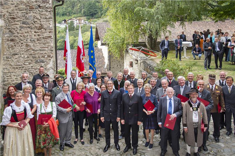 "Der uneigennützige ehrenamtliche Einsatz ist es, der unsere Gesellschaft zusammenhält und zukunftsfähig macht", mit diesen Worten würdigte heute auf Schloss Tirol Hausherr und Landeshauptmann von Südtirol, Arno Kompatscher, die 46 Persönlichkeiten aus Nord-, Ost- und Südtirol, denen im Rahmen eines Festakts das Verdienstkreuz des Landes Tirol verliehen wurde. Südtirols Landeshauptmann unterstrich dabei auch, wie wichtig Vorbilder gerade heute seien, in einer Zeit, in der viele Werte in Frage gestellt würden. "Heute ehren wir Frauen und Männer, die mehr tun, als ihre Pflicht, Menschen, die füreinander einstehen in den verschiedensten Bereichen, Menschen, die nach Tiroler Eigenart, selbst anpacken und persönliche Lebenszeit opfern", betonte Landeshauptmann Kompatscher.