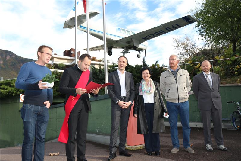 Vielen ist es vielleicht schon aufgefallen: das Kleinflugzeug, das sich aus der Vegetation im Hof der Technologischen Fachoberschule (TFO) "Max Valier" in Bozen in die Lüfte zu erheben scheint. Zwar handelt es sich um eine Installation, trotzdem ist das Flugzeug echt. Wie die Schule zur Maschine und diese auf den Hof der Schule kam, wurde heute im Rahmen einer Pressekonferenz mit Bildungslandesrat Philipp Achammer, dem Direktor des Ressorts Italienische Kultur, Wohnungsbau, Hochbau und Vermögen, Paolo Montagner, und Schuldirektorin Barbara Willimek bekanntgegeben.