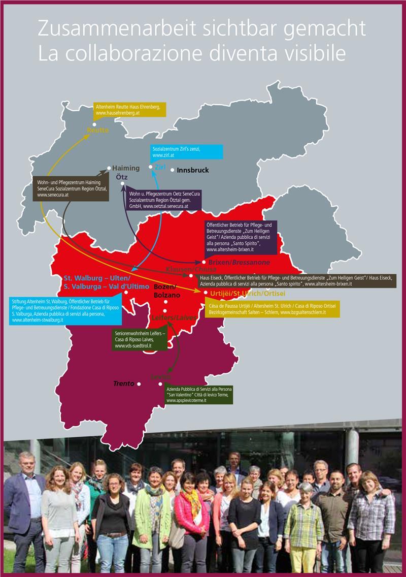 An der Initiative teilgenommen hatten in Tirol das Altenheim "Haus Ehrenberg" in Reutte, die Wohn- und Pflegezentren „SeneCura“ in Haiming und in Ötz sowie das Sozialzentrum "zenzi" in Zirl. Aus Südtiroler Sicht waren die Stiftung Altenheim St. Walburg in Ulten, das Seniorenwohnheim Leifers, das Altersheim St. Ulrich in Gröden sowie die beiden öffentlichen Betriebe für Pflege- und Betreuungsdienste "Haus Eiseck" in Klausen und Bürgerheim Brixen in den Mitarbeiteraustausch involviert. Auf Trentiner Seite hatte das Seniorenwohnheim APSP "San Valentino" in Levico Terme teilgenommen.