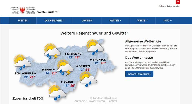 Die neuen Internetseiten sind unter der neuen URL-Adresse wetter.provinz.bz.it und wie gewohnt unter www.provinz.bz.it/wetter abrufbar.