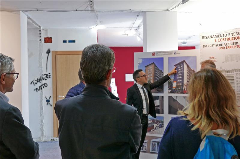 Dass die Sanierung dieses Gebäude kein Standardeingriff sei, unterstrich auch Gianfranco Minotti, Abteilungsdirektor des Wohnbauinstituts (Wobi), das die Wohnungen führt. Neben Wärmedämmungen an den Außenflächen und an den Balkonen wurde an der Südfassade eine multifunktionale Solaranlage mit einer Gesamtfläche von 250 Quadratmetern eingebaut und eine Photovoltaikanlage mit einer Höchstleistung von 25 Kilowatt. Bei einem Rundgang auf der Baustelle gemeinsam mit Ressortchef Paolo Montagner, WoBi-Direktor Wilhelm Pallfrader, Wohnbauabteilungsdirektor Stefan Walder, Architektin Melitta de Fonzo, den Technikern Massimo Vettori, Sandro Vettori sowie Mitarbeitern konnte sich Tommasini davon überzeugen, dass die Arbeiten planmäßig vorangehen. Im Sommer 2018 soll die Sanierung und architektonische Aufwertung abgeschlossen sein.