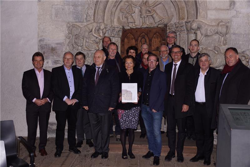 im Bild 1. Reihe: Erich Ratschiller, Bürgermeister von Tirol, Walter Hauser, Herausgeber, Alt-LH, Paula Mair, Martin Mittermair, Herausgeber, LH, LR, Leo Andergassen, Direktor Schloss Tirol; hintere Reihen: Autoren und wissenschaftliche Mitarbeitende