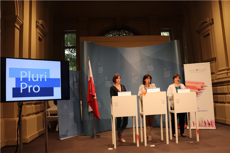 Diese Möglichkeit des Über-Grenzen-Hinausschauens nannte auch die Direktorin des Klassischen, Sprachen- und Kunstgymnasiums mit Landesschwerpunkt Musik Walther von der Vogelweide in Bozen Martina Adami als den wichtigsten Grund für die Teilnahme am Projekt PluriPro. Sie nahm heute die PluriPro-Plakette für ihre Schule entgegen; den anderen 29 Schulen wird die Plakette zugeschickt, sie soll im Schulgebäude angebracht werden, um dem Projekt Sichtbarkeit zu verleihen und zu weiteren Fortbildungen im Ausland anzuregen. Eine Fortbildung direkt vor Ort sei eine enorme Chance, um richtig in die Sprache einzutauchen, führte Direktorin Adami weiter aus. Wichtig seien auch die neuen Inputs und die Kommunikation mit Kolleginnen und Kollegen in Südtirol und im Ausland. Zu den wertvollen Erfahrungen zählen auch das Wahrnehmen unterschiedlicher Lernformen und der Rollenwechsel der Lehrpersonen, die wieder selber zu Lernenden werden.