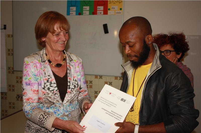 Am Ende des Lokalaugenscheins überreichte Landesrätin Stocker vier Bewohnern Bescheinigungen über ihre beruflichen Fähigkeiten. Die vier hatten am Projekt "hamet2F" teilgenommen. Dieses Projekt wird in Zusammenarbeit mit der Sozialgenossenschaft Akrat durchgeführt und hat das Ziel, die beruflichen Fähigkeiten der Teilnehmer festzustellen und ihnen so den Weg in den Arbeitsmarkt zu erleichtern.