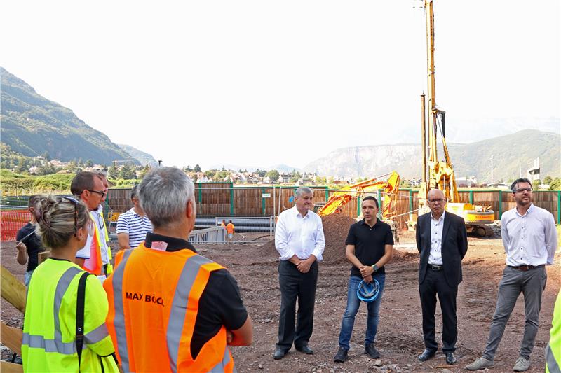 Die neue Fahrradbrücke in der Gemeinde Leifers wird die zwei Ortschaft von Leifers und Steinmannwald für Radfahrer und Fußgänger optimal miteinander verbinden. Derzeit ist die große Bohrmaschine für die Brückenpfeiler an der Baustelle im Einsatz, mit deren Hilfe die breiten Pfeiler in bis zu 30 Metern Tiefe befestigt werden. Die Landesräte Florian Mussner und Christian Tommasini haben sich heute (20. August) vor Ort ein Bild von den Bauarbeiten gemacht, die im Juli an die die Bietergemeinschaft Goller Bögl GmbH und Stahlbau Pichler GmbH übergeben wurden.