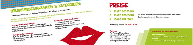 Die Gewinnerinnen und Gewinner erhalten 300 Euro, die Zweitplatzierten 200 Euro und die Drittplatzieren 100 Euro. Die besten Teilnehmerinnen und Teilnehmer dürfen zudem Südtirol beim österreichischen Jugendredewettbewerb Ende Mai 2019 in Wien vertreten.