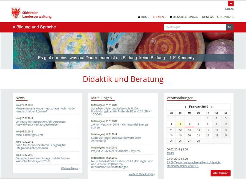 Die Deutschsprachige Schule samt dem Themenbereich "Didaktik und Beratung" hat einen neuen Webauftritt. Die neuen Webseiten finden sich unter http://www.provinz.bz.it/bildung-sprache/deutschsprachige-schule/ sowie http://www.provinz.bz.it/bildung-sprache/didaktik-beratung/.