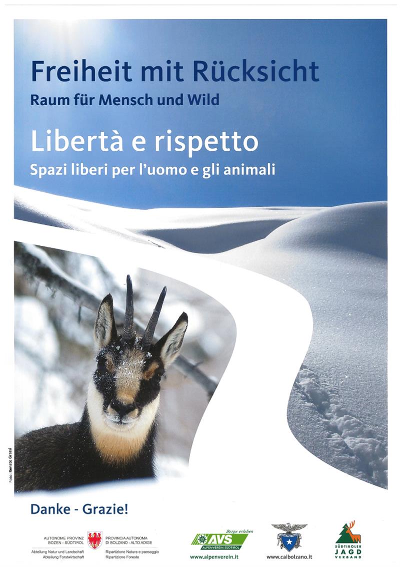 Die Kampagne "Freiheit mit Rücksicht" wurde 2010 vom Alpenverein Südtirol (AVS) in Zusammenarbeit mit dem Landesamt für Naturparke, dem Landesamt für Jagd und Fischerei, dem Südtiroler Jagdverband und dem Clup Alpino Italiano (CAI) ins Leben gerufen. Die Initiative läuft in drei Südtiroler Pilotgebieten: in Matsch und Schlinig im Vinschgau, in Latzfons/Feldthurns sowie am Dürrenstein im Naturpark Fanes Sennes Prags. Dort werden im Winter Tafeln aufgestellt, auf denen empfohlene Aufstiegsrouten und Abfahrtsbereiche gekennzeichnet sind. Teilweise werden auch Wegweiser im Gebiet selbst, dort wo empfohlene Abfahrtsrouten geschaffen wurden, angebracht. Zudem gibt es einen Info-Folder (siehe Anhang), der leicht verständlich über das Thema aufklärt.
