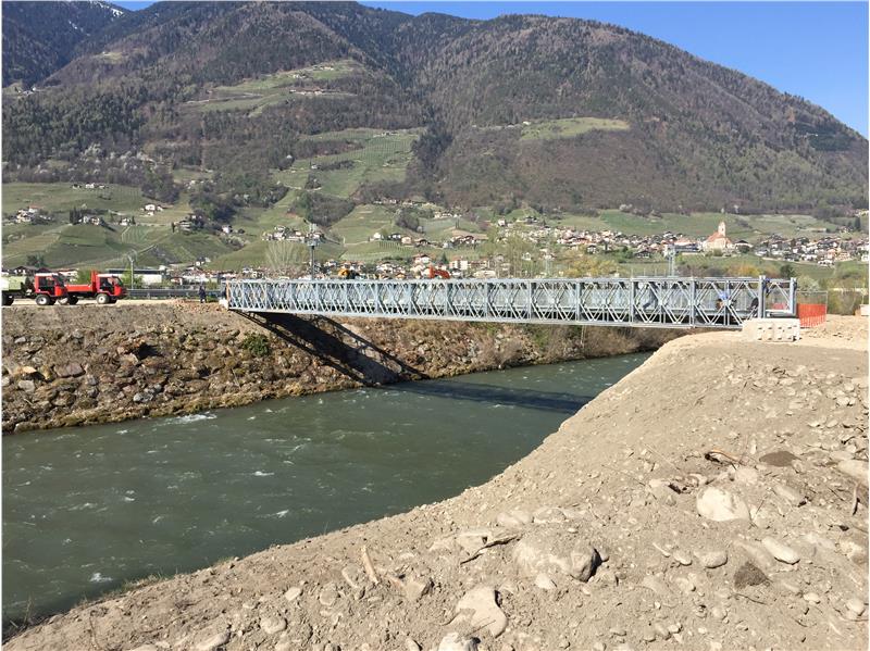 Um die Arbeiten auszuführen, wurde mit der Abteilung Straßendienst eine provisorische Brücke mit einer Spannweite von über 40 Metern auf Höhe der Obstgenossenschaft Cafa in Untermais errichtet, sodass die direkte Zufahrt von der MeBo zur Baustelle gewährleistet ist.