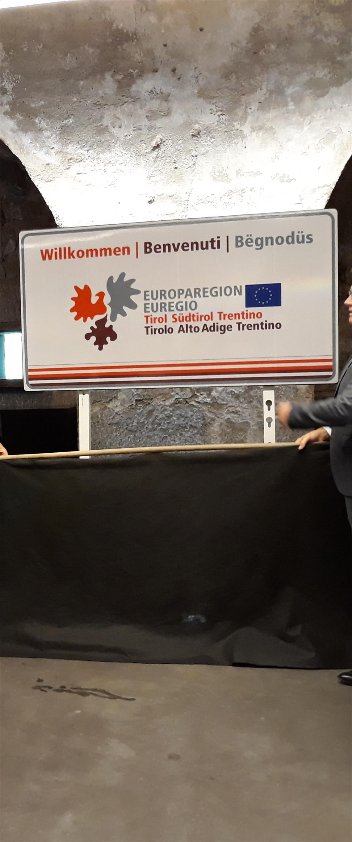 Die Wahrnehmung der Europaregion soll in der Bevölkerung einen sichtbaren Ausdruck erhalten und das Gebiet der Europaregion als europäisches Passland im europäischen Kontext auch eine erhöhte Sichtbarkeit der Europaregion für Reisende und Besucher ermöglichen. Deshalb werden an den Außengrenzen der Europaregion 150 mal 80 Quadratzentimeter große Hinweisschilder angebracht, die Reisende im Gebiet der Europaregion willkommen heißen. Auf den Hinweisschildern sind das Logo der Europaregion sowie die Aufschrift "Willkommen – Benvenuti" zu sehen, in den ladinischen Siedlungsgebieten die dreisprachige Aufschrift "Willkommen – Benvenuti – Bëgnodüs" im jeweiligen Idiom und im zimbrischen Siedlungsgebiet die Aufschrift "Wilkommen – Benvenuti – Bolkhent". Angebracht werden die Schilder an staatlichen und regionalen Grenzübergängen, im Konkreten im Landesgebiet von Südtirol und Trentino auf den Straßenübergängen zu italienischen Regionen Venetien und Lombardei und der Schweiz sowie im Gebiet des Landes Tirol bei Straßenübergängen zu Deutschland, der Schweiz und zu den österreichischen Bundesländern Vorarlberg, Salzburg und Kärnten.