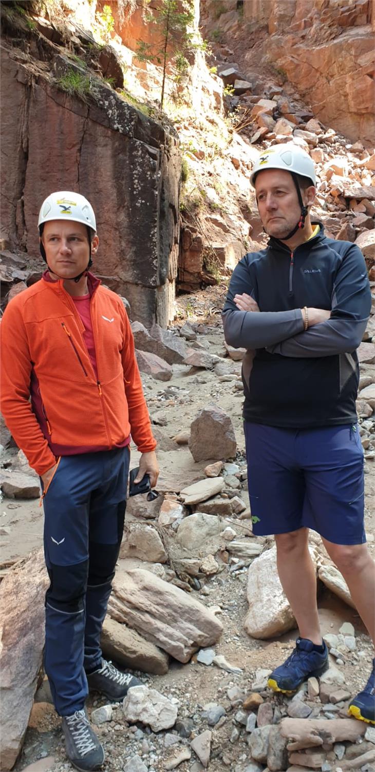 Bei seiner Stippvisite konnte Bessone auch die Ergebnisse eines Eingriffs zur Sicherung eines Porphyrkamms im Bletterbach-Canyon begutachten, den die Geologen des Landesamts für Geologie und Baustoffprüfung Ende Juni vorgenommen haben. Die Landesgeologen überprüfen regelmäßig die Sicherheit im Canyon. Bereits im Mai 2018 waren auf dem Kamm, der offensichtlich Risse aufwies, Dehnungsmessstreifen angebracht worden, ebenso wie spezielle Geräte zur Überwachung der Gesteinsbewegungen. Heuer im Mai und Juni hatten die Geräte eine exponentielle Beschleunigung der Verschiebung gezeigt. Durch den vom Landesamt für Geologie und Baustoffprüfung beauftragten und vom Unternehmen Locher vorgenommenen Eingriff unter Leitung des Geologen Giacomo Nardin wurden etwa 200 Kubikmeter abbruchgefährdetes Gestein abgetragen. Auf diese Weise wurde eine eindrucksvoller Teil des Canyons für die Besucher gesichert und zugänglich gemacht. In die Arbeiten waren auch die Geoparc-Mitarbeiter und Mitarbeitern der Landesabteilung Forstwirtschaft involviert.