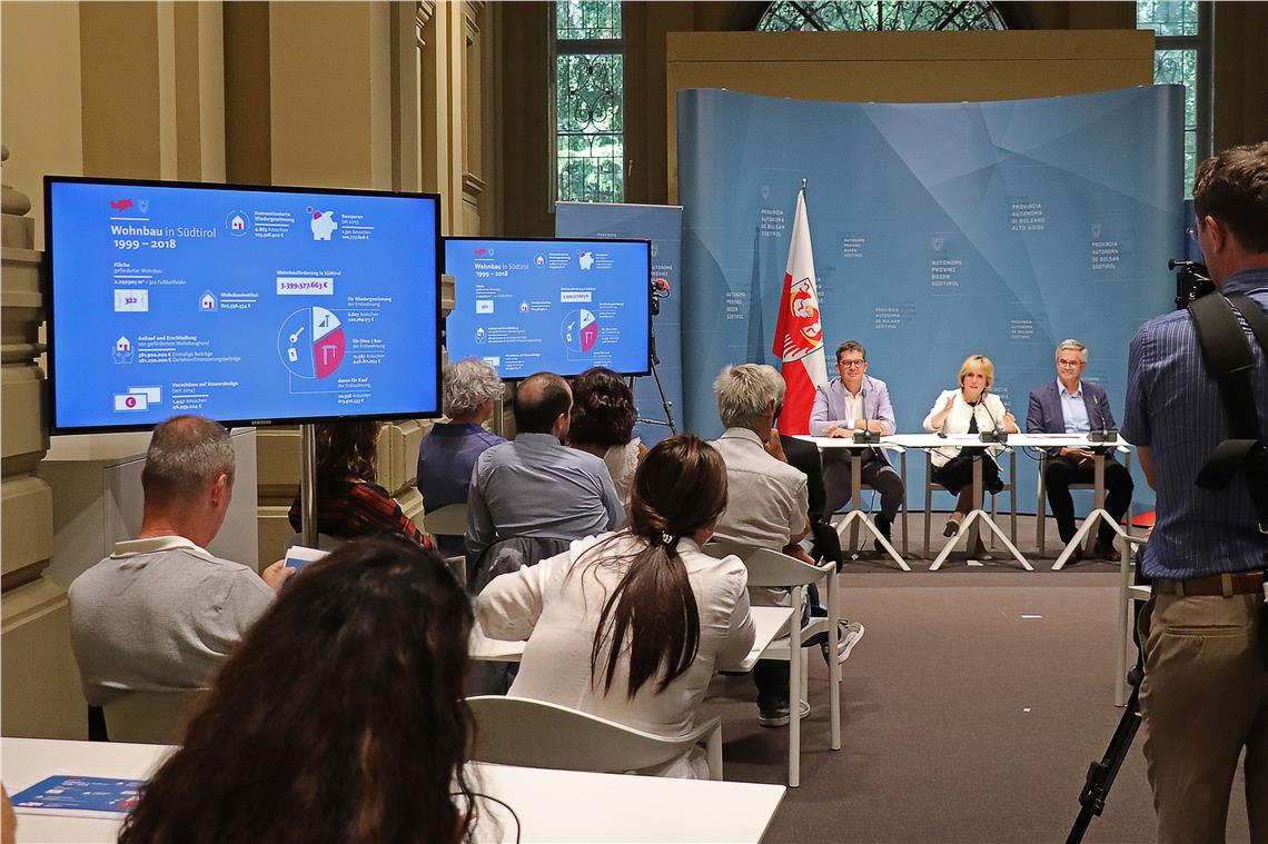 Umrahmt von Landesabteilungsdirektor Stefan Walder und Wobi-Präsident Heiner Schweigkofler stellte Wohnbaulandesrätin Waltraud Deeg heute (17. Juli) Kennzahlen und Fakten zum Wohnbau in Südtirol dar. "Man kann es nicht anders bezeichnen als eine Erfolgsgeschichte, hat doch die Wohnbauförderung in Südtirol zahlreichen Menschen zur Realisierung ihres Wohntraums verholfen", hob Landesrätin Deeg hervor. Eine Wohnung sei ein Lebensprojekt. Das Land Südtirol habe es in den vergangenen 20 Jahren mit beinahe 3,4 Milliarden Euro unterstützt.