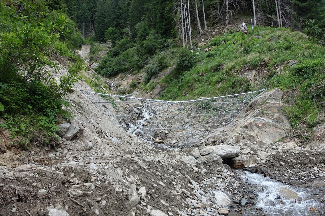 Das Landesamt für Wildbach- und Lawinenverbauung West hat im Töllgraben zwischen Algund und Partschins eine Netzsperre gebaut. Das ist eine Sperre, die aus Stahlseilen und Netzen errichtet und mittels Seilanker im Bachbett verankert wird. Die Sperre ist rund vier Meter hoch und zwischen sechs und zwölf Meter breit, berichtet Bauleiter Roland Schweitzer vom Amt für Wildbach- und Lawinenverbauung West in der Agentur für Bevölkerungsschutz. Dabei handelt es sich um einen innovativen Bautyp, der vom Unternehmen Maccaferri für den selektiven Rückhalt von Geröll konzipiert ist.