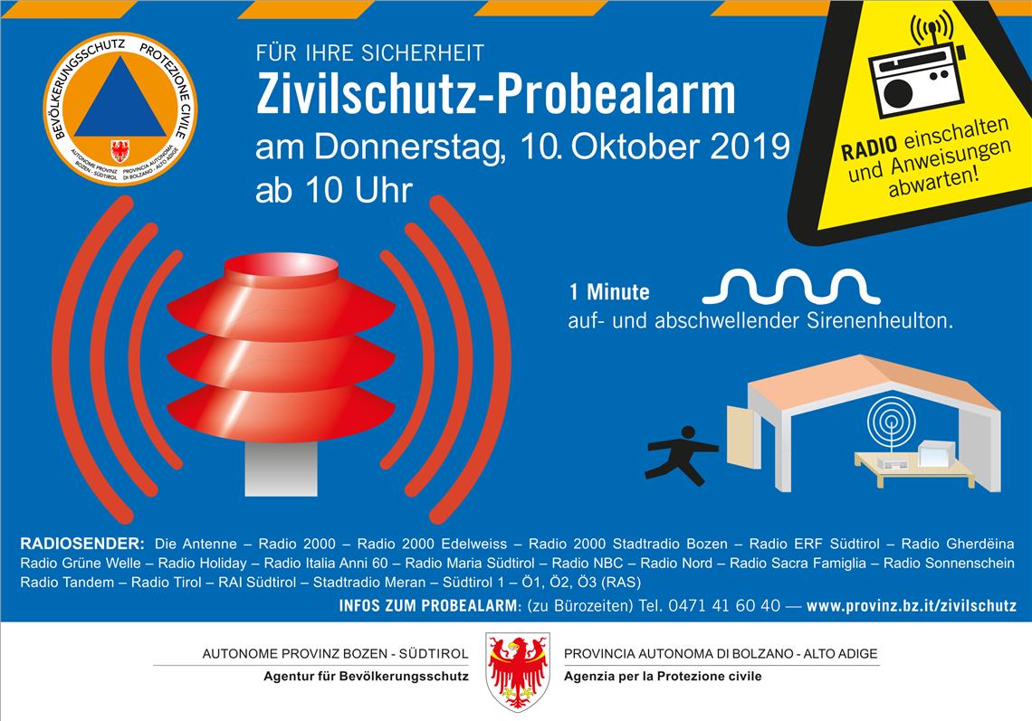Am kommenden Donnerstag, dem 10. Oktober, werden um circa 10 nach 10 Uhr in ganz Südtirol eine Minute lang Sirenen zu hören sein. Mit diesem Probealarm soll die Funktionstüchtigkeit des Alarmierungsnetzes getestet und die Bevölkerung mit dem Zivilschutzsignal vertraut gemacht werden.