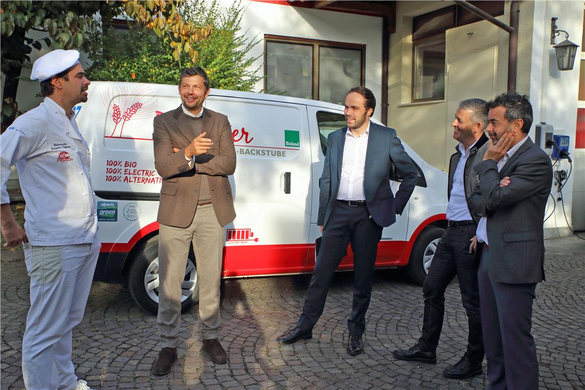 Im September 2019 wurden in Südtirol 355 neu zugelassene Elektrofahrzeuge registriert. Rund 300 davon kommen in Unternehmen und Betrieben zum Einsatz. Damit hat die Elektromobilität im Südtiroler Alltag Fuß gefasst. Von der Alltagstauglichkeit der E-Mobilität haben sich Mobilitätslandesrat Daniel Alfreider, Wirtschaftslandesrat Philipp Achammer, der Brixner Bürgermeister Peter Brunner und Joachim Dejaco, Generaldirektor der STA - Südtiroler Transportstrukturen AG kürzlich am Betriebsgelände der Naturbackstube Profanter ein Bild gemacht. Profanter hat im Jahr 2018 mit seinem Gesamtkonzept "Mit dem Strom gegen den Strom" den Südtiroler Mobilitätspreis gewonnen.