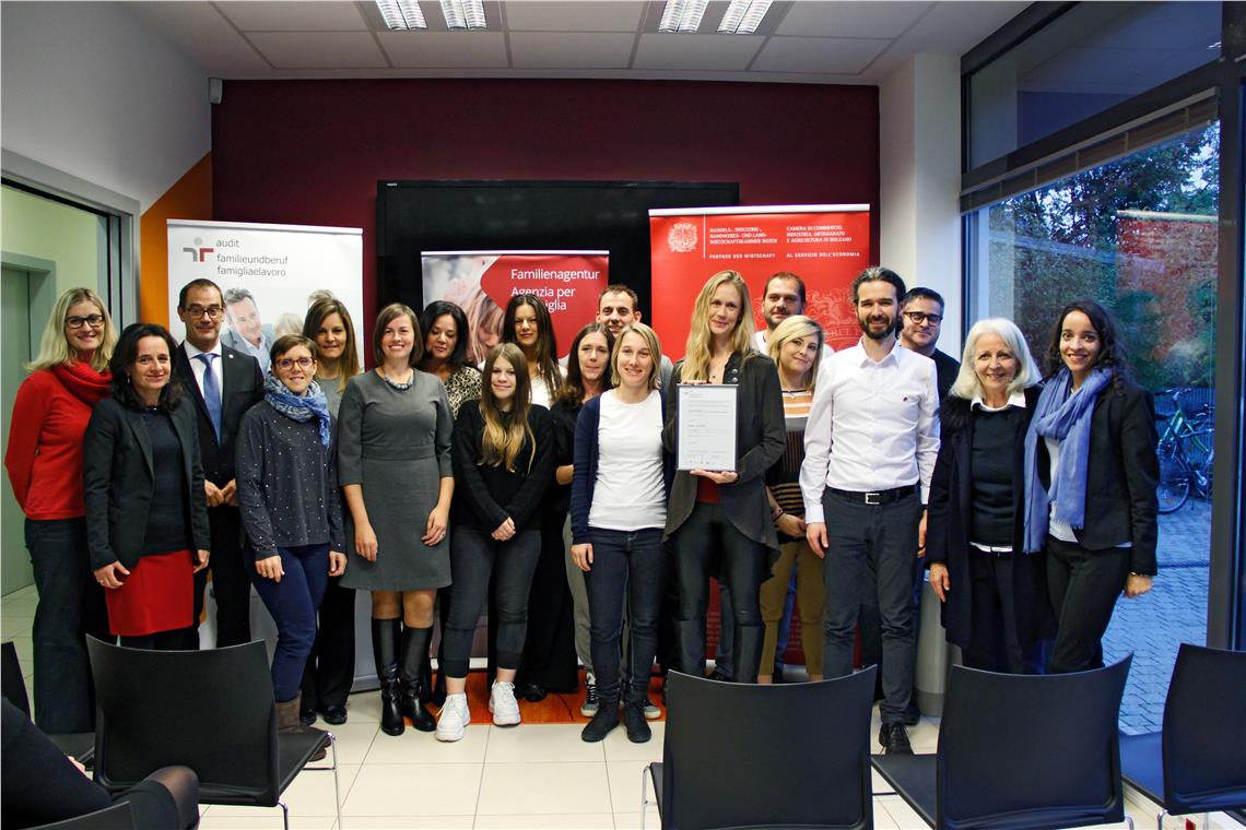 Das Audit "familieundberuf" begleitet Arbeitgeber auf ihrem Weg hin zu einer familienfreundlichen Personalpolitik. Der mehrstufige Auditierungsprozess wird vom Land Südtirol (Familienagentur) und der Handelskammer Bozen begleitet. Weitere Informationen dazu gibt es auf der Internetseite des Landes Südtirol im Bereich Familie (www.provinz.bz.it/audit).