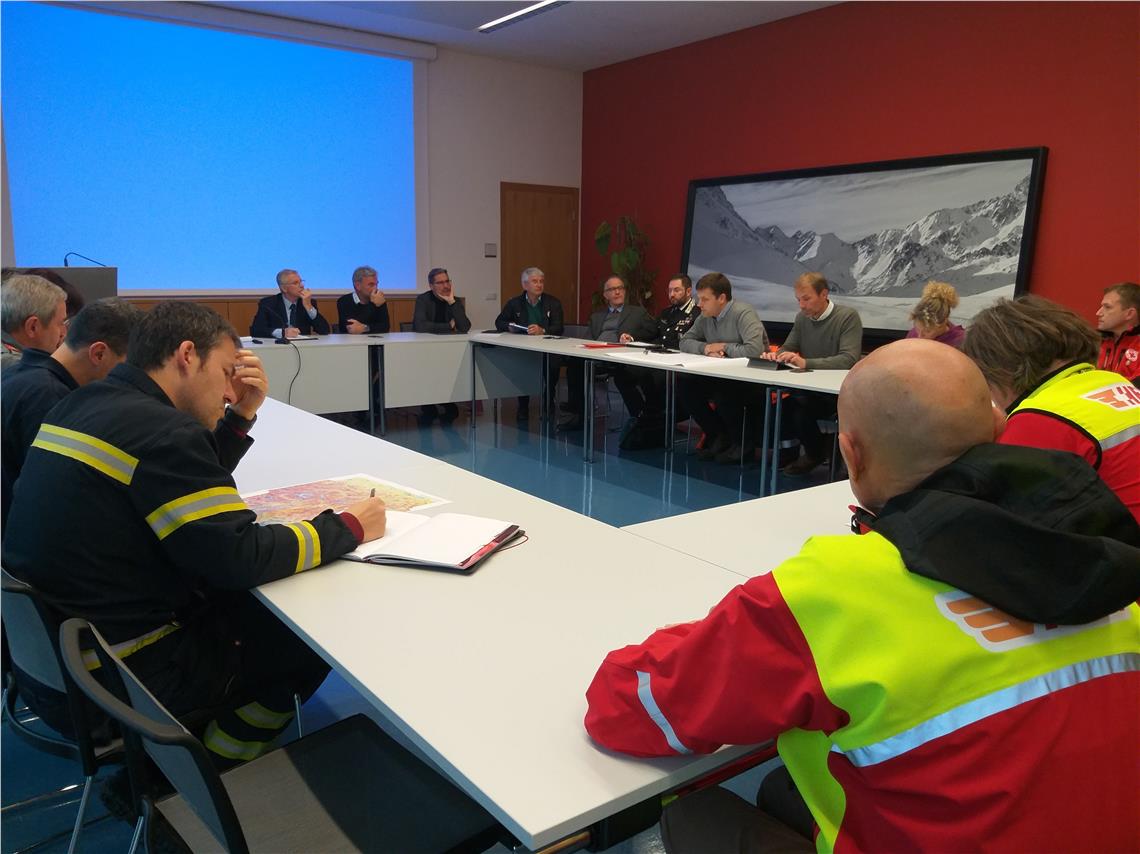 Die Landesleitstelle mit Landesrat Schuler, Landeshauptmann Kompatscher und Regierungskommissär Cusumano hat heute (17. November) in der Agentur für Bevölkerungsschutz getagt.