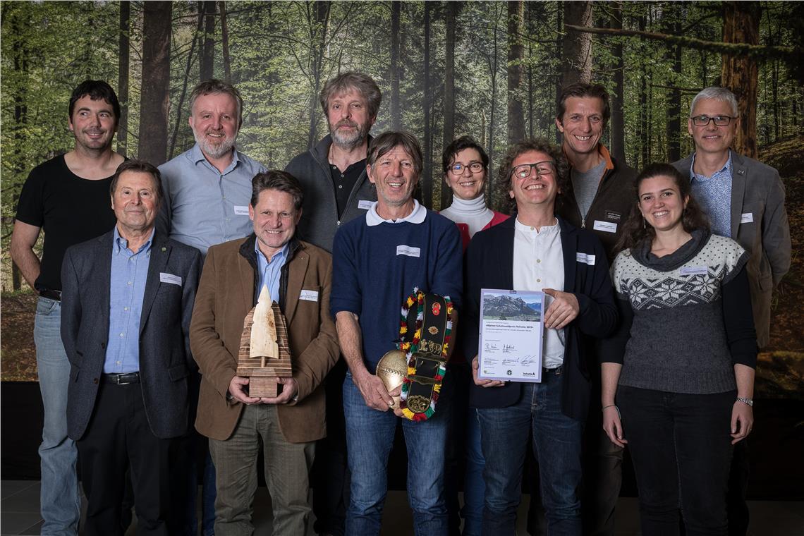 Preisverleihung in St. Gallen am 31.01.2020 (von li. vorne nach re., nach li. hinten): Jurymitglied Florin Florineth, Bürgermeister von Gais Christian Gartner, Bauernbund-Ortsobmann St. Georgen Michael Piffrader, Projektkoordinator GBK der Agentur für Bevölkerungsschutz Peter Hecher, Mitarbeiterin Agentur für Bevölkerungsschutz Kathrin Blaas, Forstvereins-Mitglied Christoph Hintner, Forststation Sand in Taufers und Forstverein Südtirol Christian Lamprecht, Mitarbeiterin Agentur für Bevölkerungsschutz Caterina Ghiraldo, Vorstandsmitglied Verein Naturtreff Eisvogel Ernst Girardi, Gemeinderat Sand i.T. und Fraktionsvorsteher Kematen Andreas Voppichler, Präsident Verein Naturtreff Eisvogel und Fraktionsvorsteher St. Georgen Klaus Graber. © Lorenz Reifler