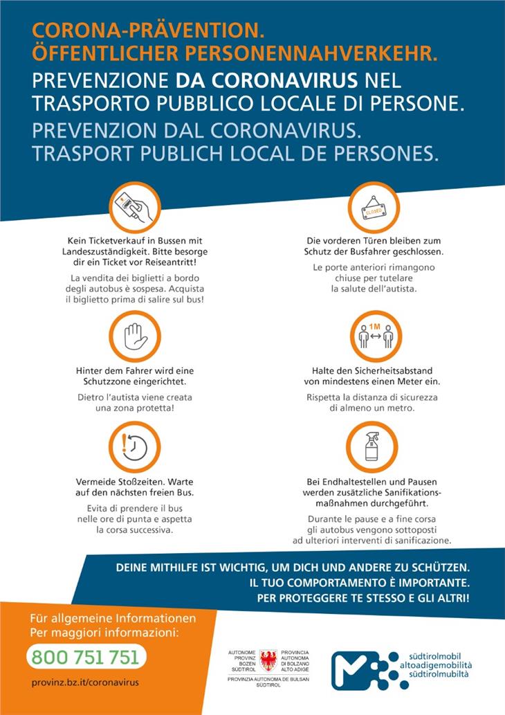 Aufruf von LR Alfreider: Öffentliche Verkehrsmittel sind derzeit nur für unerlässliche Fahrten zu nutzen. Kinder und ältere Menschen sollten nicht fahren. Ansonsten müssen Fahrten eingestellt werden.