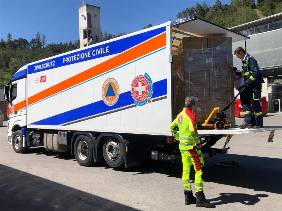 Der Zivilschutz des Weißen Kreuzes wurde mit der Abholung in der Feuerwehrschule Telfs in Tirol beauftragt. Gestern (22. April) am späten Nachmittag sind zwei Lastkraftwagen vom Zivilschutz des Weißen Kreuzes mit den 15.000 Schutzanzügen am Sitz des Bevölkerungsschutzes an der Drususallee in Bozen eingetroffen. Von hier aus wird der Großteil zur Verteilung ans Zentrallager des Südtiroler Sanitätsbetriebes geliefert, der die weitere Zuteilung vornimmt; der Rest wird von der Agentur für Bevölkerungsschutz direkt verteilt. "Ein herzliches Vergelt’s Gott nach Nord- und Osttirol", schickt Landeshauptmann Arno Kompatscher: "Die Europaregion Tirol-Südtirol-Trentino hat einmal mehr gezeigt, dass sie nicht nur eine Schönwetter-Gemeinschaft ist."