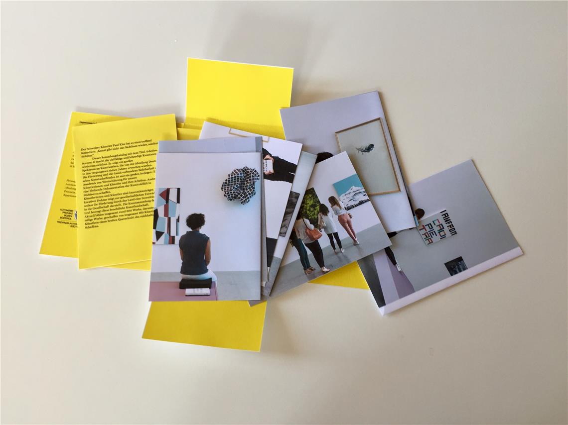 Noch bis zum 23. August finden sich 60 dieser Kunstwerke nicht in den Landhäusern sondern in der Ausstellung "unlearning categories" im Museion in Bozen. Sie machen sozusagen Urlaub vom Büroalltag und sind in einem völlig anderen Kontext zu sehen. Von diesem Ausflug ins Museum gibt es nun Urlaubsgrüße: In der kommenden Woche erscheint eine Edition mit 48 Postkarten der ausgestellten Kunstwerke, die der Südtiroler Fotograf Luca Guadagnini im aktuellen Setting aus neuer Perspektive abgelichtet hat. Die Mappe mit den losen Kärtchen stellt einen spielerischen Bezug zum Ausstellungstitel "unlearning categories" und dem offenen Konzept der Kuratorinnen her. Sie bietet eine weitere Möglichkeit, gewohnte "Kategorien aufzubrechen, zu verlernen" und "die Karten neu zu mischen", wie es die Projektleitung.