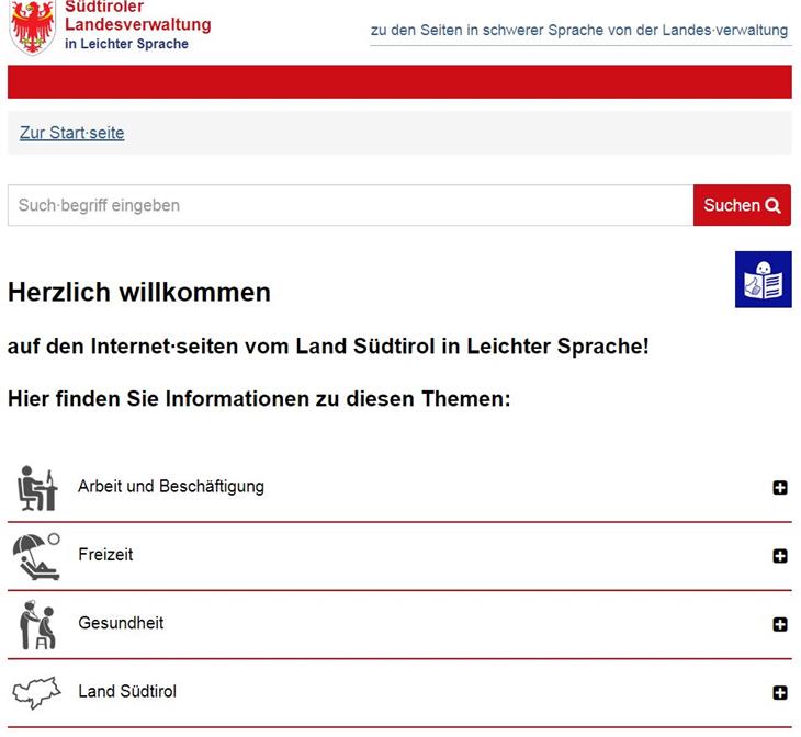 Unter https://leichte-sprache.provinz.bz.it/ stellt die Landesverwaltung als erste öffentliche Verwaltung in Südtirol wichtige Informationen für Menschen mit einer Kommunikationseinschränkung bereit.