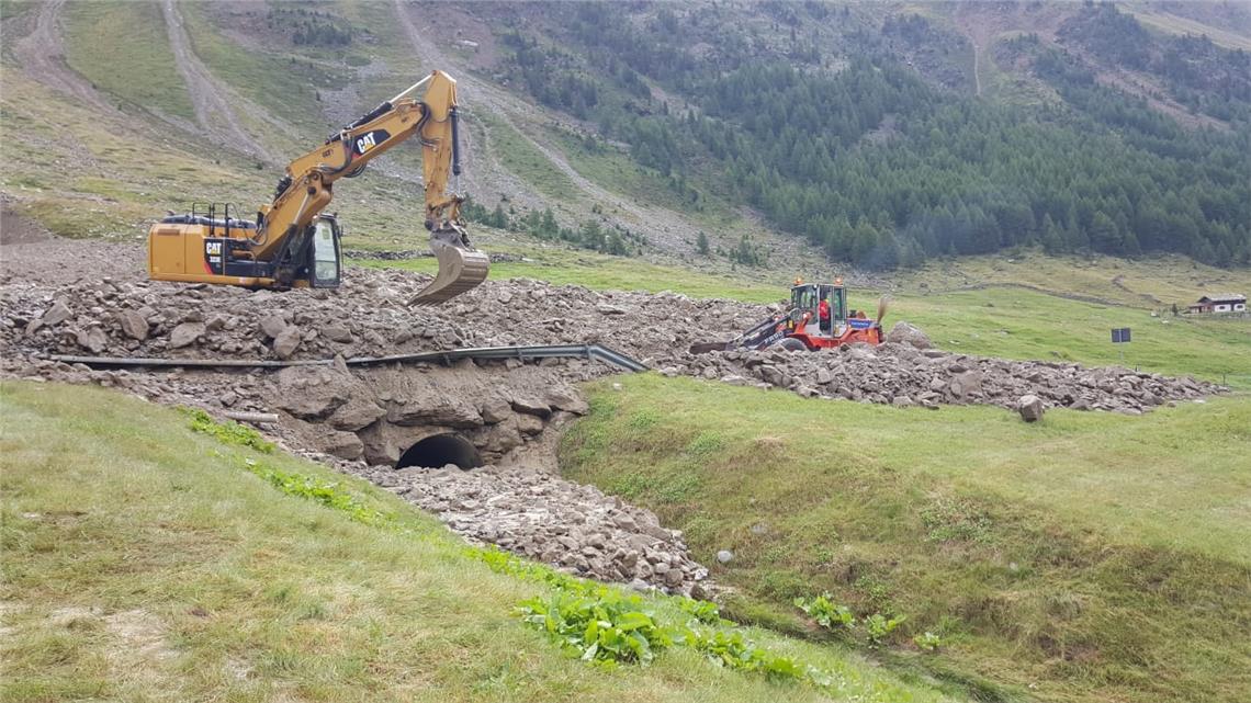 Nach den heftigen Gewittern mit Starkregen am gestrigen Abend (12. August) hatte eine Mure die Landesstraße 3 im Schnalstal bei der Ortschaft Kurzras in der Gemeinde Schnals verlegt.